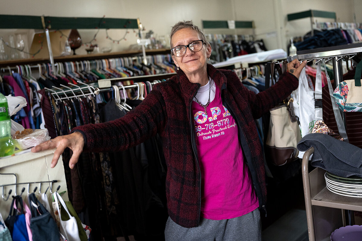 Casey Tobias poses in the Homeless Outreach Practiced Everyday free store on Oct. 11, 2025, in Three Rivers, Michigan. Tobias is one of the activists who joined forces to demand local government move quickly to address lead in the water supply.
